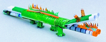 1. 通过欣赏图片“狮子”“鳄鱼”“长颈鹿”“小熊”“小乐队”等了解学习纸卷魔术的方法。学生是学习的主体和自身发展的主人。在欣赏中总结了卷、撕、剪、贴、折、绕等基本的制作方法。特别重点欣赏并分析了“小乐队”,让学生体会到卷的不同的方法——圆柱式卷和锥形卷。通过欣赏其他卷的物体,让学生直观地了解并掌握纸卷魔术的制作方法。