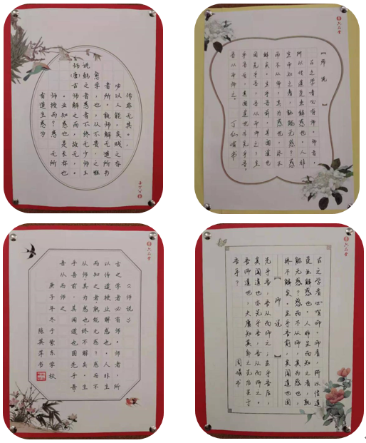 参赛的老师们全力投入,精心书写,在小小的田字格之间挥洒书之豪气,他们兴致勃勃,屏气凝神,从布局谋篇、字间关系、单字结构到笔画的起行收,每一处都经过精心琢磨,将韩愈的《师说》演绎出不同的版本,最后选出自己中意的作品参赛。