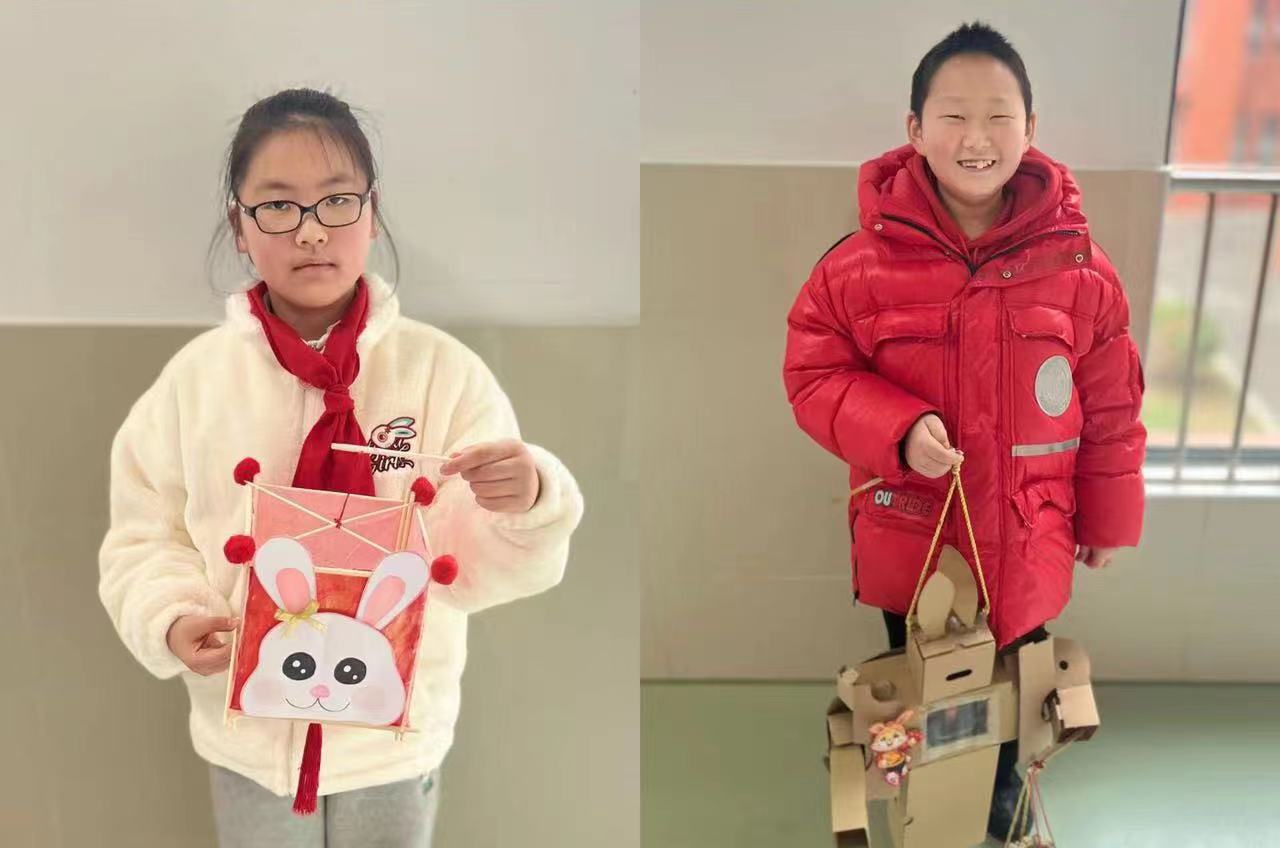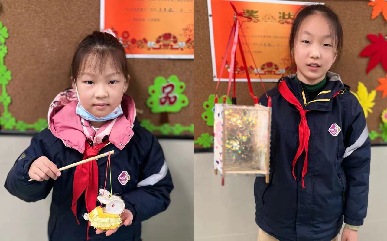 低年段的小朋友们积极动手体验做手工的乐趣,把对新年的愿望和祝福都融入到自制的花灯中,一盏盏创意无限的“兔子灯”,在他们那一双双灵巧的小手中活灵活现,栩栩如生,元宵节氛围感瞬间拉满。瞧,他们的创意多棒!有的用了易拉罐,有的用了洗脸巾,还有的用了报纸......将生活中的废旧物品变成了一盏盏漂亮的小花灯。