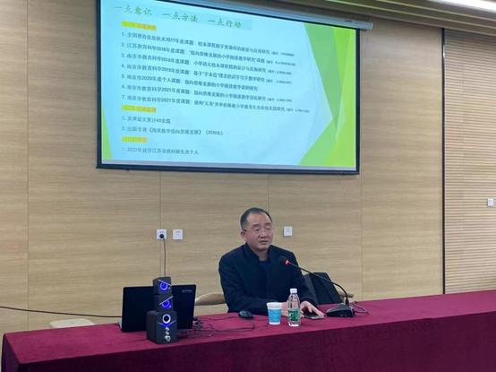 活动首先由特邀课题专家晓庄实小的吴善虎校长做了《一点意识·一点成长·一点行动》的专题讲座。吴校长结合自己的教科研工作经历,倡仪老师们要扎根一线,立足课堂,教思结合,课题研究有的放矢,论文撰写水到渠成。
